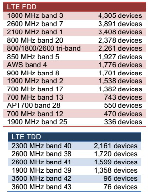 報(bào)告顯示,雖然大部分的終端支持FDD頻段,來自TDD頻段的終端數(shù)量仍在增長(zhǎng),達(dá)到2797款,占比39.7%,其中1952款終端是智能手機(jī)。在終端頻譜分布方面,1800MHz是LTE終端分布最廣的頻段,共4305款終端工作在這個(gè)頻段,占比61.1%。LTE終端具體的頻譜分布如下圖: