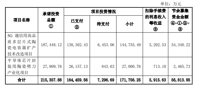 截至 2022 年 11 月 18 日,公司“5G 通信用高品質(zhì)多層片式陶瓷電容器擴(kuò)產(chǎn)技術(shù)改造項(xiàng)目”及“半導(dǎo)體芯片封裝用陶瓷劈刀產(chǎn)業(yè)化項(xiàng)目”已建成達(dá)產(chǎn),項(xiàng)目募集資金節(jié)余56,813.95 萬(wàn)元。