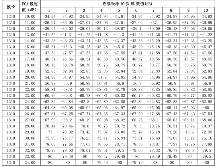 被測標準線的回損值RL=-14.8dB,調節(jié)衰減器POA,按設定衰減量逐步增大衰減值,記錄設定的每個衰減值以及連續(xù)讀取10次測量RL值,計算測量值Δ (RL.max - RL.min),并進行數(shù)據(jù)分析。實驗過程如以下視頻所示。我們分別對1310nm和1550nm波長,設定POA衰減值遞增,分別讀取 10次測量 RL值。