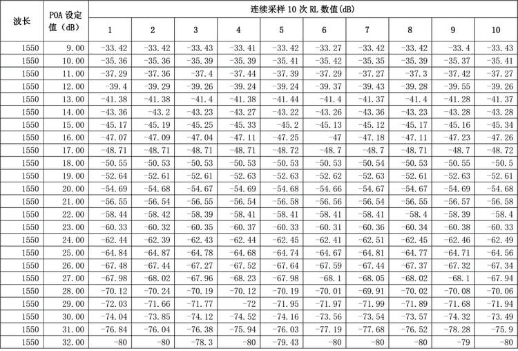 通過以上分別對波長1310nm和1550nm實際回損值測試數(shù)據(jù)分析,當RL>-70dB時,RL波動范圍Δ<0.5dB, 當RL處于-70dB~-75dB范圍時,RL波動范圍Δ<1.5dB ;當RL處于~75dB-80dB時, 波動范圍Δ<2.5dB。
