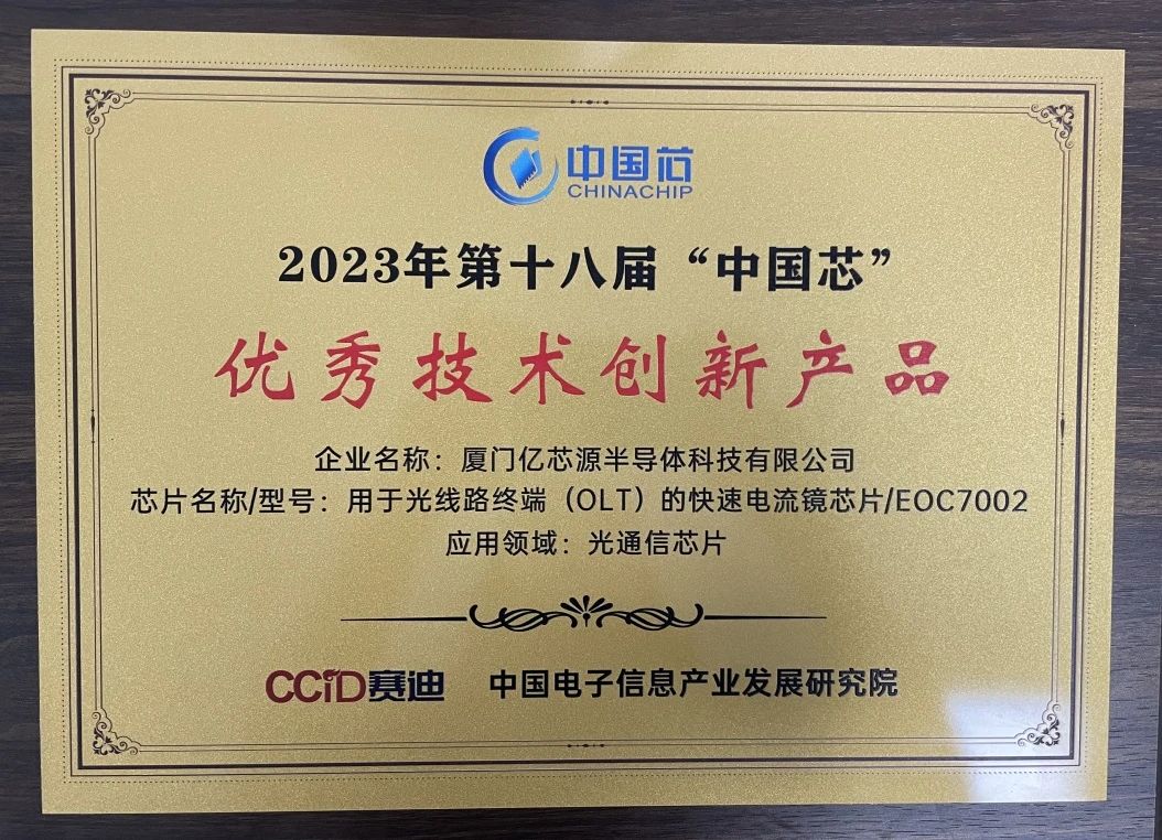 ICC訊 9月20日,由中國電子信息產(chǎn)業(yè)發(fā)展研究院、橫琴粵澳深度合作區(qū)執(zhí)行委員會、珠海市人民政府聯(lián)合主辦的2023琴珠澳集成電路產(chǎn)業(yè)促進峰會暨第十八屆“中國芯”頒獎儀式在珠海順利召開。本次峰會聚焦中國集成電路產(chǎn)業(yè)的前沿成果,廈門億芯源研發(fā)的用于光線路終端(OLT)的快速電流鏡芯片(EOC7002),憑借出色的產(chǎn)品自主創(chuàng)新力在285家企業(yè)的398款參賽芯片產(chǎn)品中脫穎而出,榮獲第十八屆“中國芯”優(yōu)秀技術(shù)創(chuàng)新產(chǎn)品。
