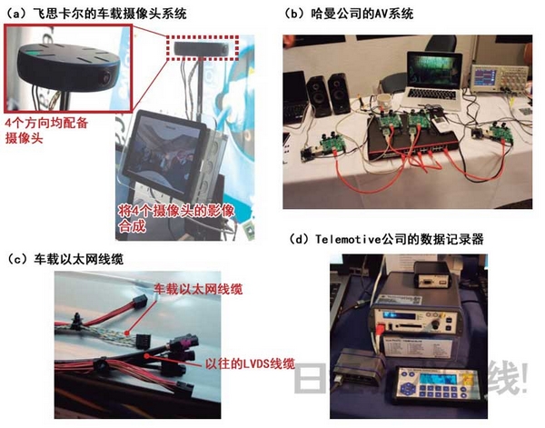 在2012年9月于德國舉行的“2nd Ethernet & IP @ Automotive Technology Day”上,各企業(yè)紛紛公開了利用車載以太網(wǎng)的演示。例如,飛思卡爾展示了攝像頭系統(tǒng)(a)。與寶馬預(yù)定2013年采用的車載攝像頭系統(tǒng)采用基本相同的構(gòu)成。哈曼展示了計(jì)劃2014年實(shí)用化的AV系統(tǒng),S-Y Systems Technologies Europe展示了車載以太網(wǎng)用線纜(b、c)。由于實(shí)用化近在眼前,數(shù)據(jù)記錄器等工具也大量展出(d)。