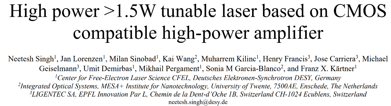最近,大模式面積(LMA)波導(dǎo)技術(shù)的進(jìn)步使集成放大器的輸出功率達(dá)到了瓦級(jí)。本文介紹利用 CMOS 兼容型集成 LMA 功率放大器將大范圍可調(diào)諧激光器放大到 1.5 瓦高功率的設(shè)計(jì)和實(shí)驗(yàn)演示。