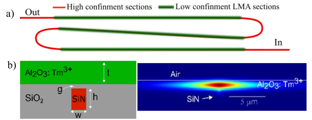 圖 1:a) 器件布局顯示高約束(紅色)和 LMA(綠色)部分。b) LMA 部分的波導(dǎo)截面和信號(hào)的模式剖面。在高約束部分,光模式被緊密約束在氮化硅(SiN)波導(dǎo)層中。這樣就能實(shí)現(xiàn)泵浦光和信號(hào)光的高效耦合,以及波導(dǎo)的緊密彎曲,從而實(shí)現(xiàn)緊湊型鏈路。