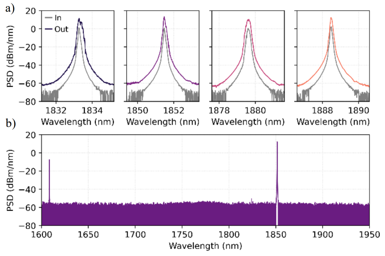 圖 3:a) 輸入和輸出的信號(hào)光譜顯示放大。