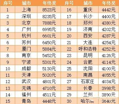 截至目前,已經(jīng)拿到年終獎的比例僅為13.4%,20.5%的白領(lǐng)表示企業(yè)承諾年后發(fā)放。從行業(yè)看,最令人艷羨的依舊是金融業(yè),年終獎平均高達1.7萬元。根據(jù)網(wǎng)絡(luò)消息報導:互聯(lián)網(wǎng)企業(yè)一些大咖的年終獎簡直就是一個壕。百度年會上李彥宏曾宣布,員工最高拿到50個月工資。阿里員工自爆,按月薪2萬來算,能拿到15個月年終獎,加上3000股股票,相當于100個月的工資。騰訊除了游戲和微信兩個土豪事業(yè)部以外,北京員工能拿到0-4個月年終獎。網(wǎng)易有17薪,也就是5個月的年終獎,如果公司業(yè)績好可能會多發(fā)一個月過節(jié)費。下圖為各大城市年終獎排行榜: