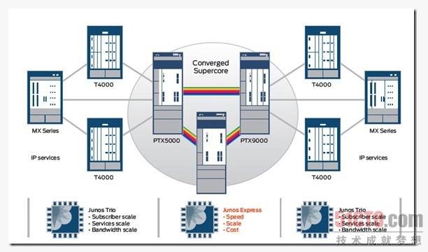 Juniper日前發(fā)布一系列超級核心網(wǎng)(Supercore)設備,主要是Junos Express chipset和PTX系列超級核心分組傳輸交換機(Supercore Packet Transport Switch)。Juniper對超級核心網(wǎng)的解決方案著重在于集成的傳輸(transport)和交換(switch)。PTX產(chǎn)品說白了,就是交換機,是容量超大、集成了光傳輸和IP/MPLS的交換機。