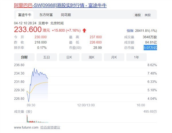 然而截止到中午13:00,阿里巴巴港股股價大漲7.16%,截稿前報233.6港元,改變雖然沒有實施,剛剛公布,就有如此的“效果”,可以說阿里巴巴也是“一呼百應”的。