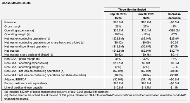 2023財(cái)年第四季度,EMCORE的綜合營收為2680萬美元。按公認(rèn)會計(jì)原則(GAAP)和非公認(rèn)會計(jì)原則(Non-GAAP)計(jì)算,凈虧損分別為4260萬美元和200萬美元。調(diào)整后的息稅折舊攤銷前利潤(EBITDA)為負(fù)90萬美元。