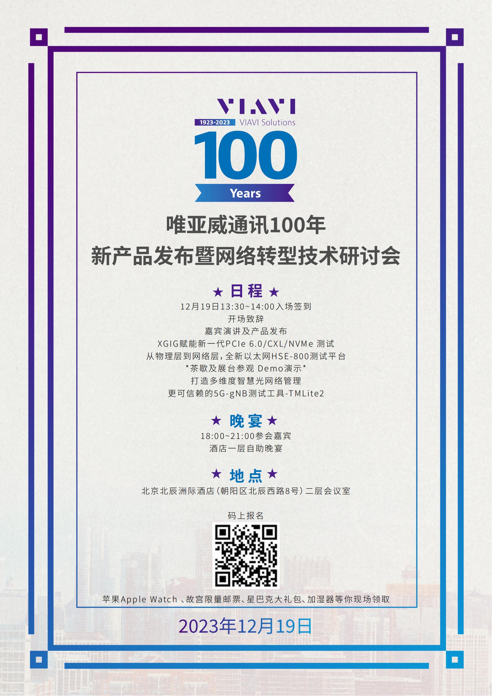 值此100周年之際,我們誠摯邀請您參加VIAVI 100周年——新產(chǎn)品發(fā)布暨網(wǎng)絡(luò)轉(zhuǎn)型技術(shù)研討會,和我們一起慶祝這一歷史性時刻,共同見證VIAVI新產(chǎn)品亮相以及探討網(wǎng)絡(luò)轉(zhuǎn)型趨勢和技術(shù)發(fā)展藍(lán)圖。