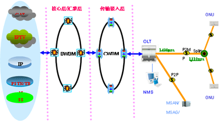 用性價比較高的CWDM組成傳輸接入層網(wǎng)絡(luò),初期投資低,具有平滑升級的特點,原有的MSTP環(huán)網(wǎng)業(yè)務(wù)通過割接用CWDM一個波長來承載,充分利用了原有設(shè)備資源;同時后期擴容方便。