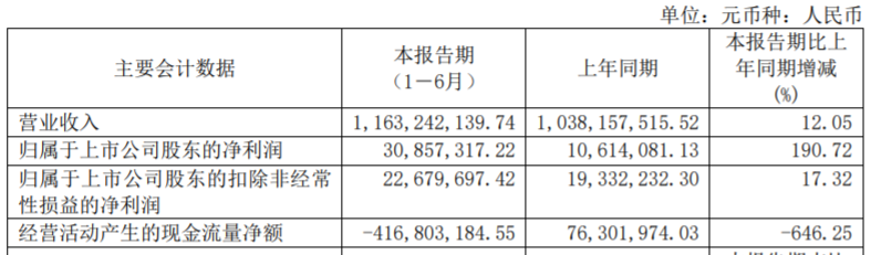 ICC訊 (編輯:Nicole) 廣東九聯(lián)科技股份有限公司(以下簡稱“九聯(lián)科技”或“公司”)發(fā)布2021 年半年度報告稱:公司上半年實現(xiàn)營業(yè)收入11.63億元,同比增長12.05%;歸屬于上市公司股東的凈利潤3085.73萬元,同比增長190.72%;歸屬于上市公司股東的扣除非經(jīng)常性損益的凈利潤2267.97萬元,同比增長17.32%?;久抗墒找?.0686元。