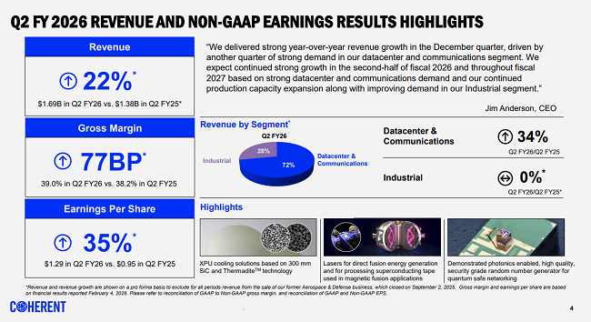 ICC訊 周三,全球光子學領(lǐng)導(dǎo)者Coherent Corp.公布了截至2025年12月31日的2026財年第二季度財務(wù)業(yè)績。該季度營收為16.9億美元,GAAP毛利率為36.9%,GAAP每股攤薄收益為0.76美元。非GAAP毛利率為39.0%,非GAAP每股攤薄收益為1.29美元。