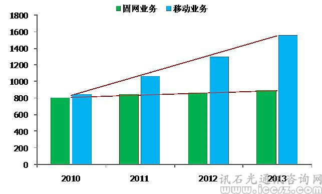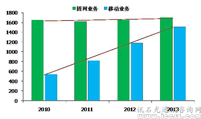 2010至2013年中國聯(lián)通移動業(yè)務(wù)與固網(wǎng)業(yè)務(wù)經(jīng)營情況走勢圖(億元)