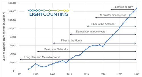 ICCSZ訊(編譯:Nina)LightCounting(LC)近日發(fā)布了一份關(guān)于虛擬OFC2020亮點(diǎn)的報告。LC認(rèn)為,不用過分擔(dān)心經(jīng)濟(jì)形勢的惡化,一切很快就會過去,并堅持光模塊市場的長期走勢樂觀(如下圖所示)。我們之前曾經(jīng)經(jīng)歷過兩次衰退,如果參照近期的歷史,那么當(dāng)前的衰退將是短暫的(至少對于我們的行業(yè)而言)。在過去的二十年中,許多光連接新應(yīng)用涌現(xiàn),未來十年中,還會有新的應(yīng)用出現(xiàn)。就像持續(xù)低迷期間一樣,趨勢指向了更短...,更短距離的光學(xué)連接。那么接下來光學(xué)器件是否會取代印刷電路板上的銅走線?