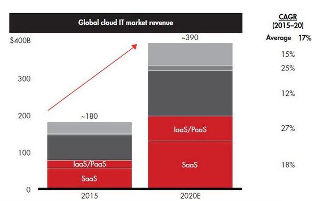 報(bào)告稱,到2020年,全球云計(jì)算市場收入將達(dá)到3900億美元,與2015年時(shí)的1800億美元規(guī)模相比,CAGR為17%。同時(shí)期內(nèi),基于SaaS(軟件即服務(wù))的應(yīng)用市場規(guī)模的CAGR為18%,基于IaaS/PaaS(基礎(chǔ)設(shè)施即服務(wù)/平臺(tái)即服務(wù))應(yīng)用市場規(guī)模的CAGR為27%。