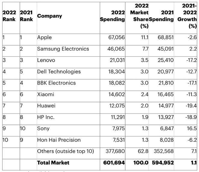 不過(guò),2022年的十大芯片買(mǎi)家較2021年未發(fā)生改變。其中,蘋(píng)果和三星電子保持前兩名,華為保持在第七的位置。