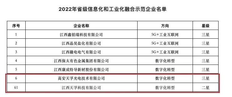 為貫徹國家《關(guān)于深化新一代信息技術(shù)與制造業(yè)融合發(fā)展的指導意見》及《江西省信息化和工業(yè)化融合示范企業(yè)認定管理辦法》等文件要求,發(fā)揮制造業(yè)數(shù)字化轉(zhuǎn)型示范引領(lǐng)作用,江西省工業(yè)和信息化廳日前開展了省級信息化和工業(yè)化融合示范企業(yè)認定工作。認定高安天孚光電技術(shù)有限公司為江西省兩化融合數(shù)字化轉(zhuǎn)型三星示范企業(yè),認定江西天孚科技有限公司為數(shù)字化轉(zhuǎn)型二星示范企業(yè)。