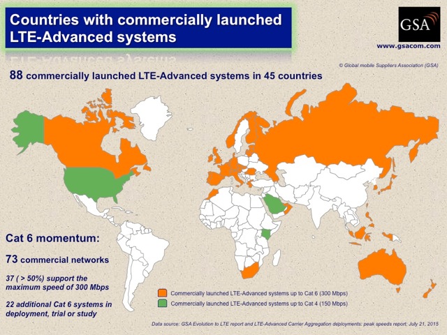 ICCSZ訊 2015年在全球范圍內已經(jīng)有131家運營商堅定地采取部署LTE-Advanced的態(tài)度,且在60個國家中有超過30%的運營商正在投資于LTE-Advanced。載波聚合是第一個LTE-Advanced的功能來實現(xiàn)商業(yè)化,可使運營商有效地結合頻譜資源,以提供移動寬帶服務客戶體驗。