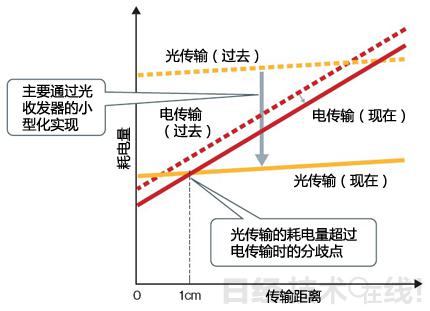 如果傳輸距離在1cm以上,目前的光傳輸技術(shù)的耗電量小于電傳輸。光傳輸?shù)暮碾娏恐饕枪馐瞻l(fā)器的電光轉(zhuǎn)換以及光電轉(zhuǎn)換消耗的。最近大幅減小了光收發(fā)器的尺寸,因此耗電量也減小了。