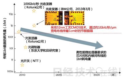 比如,2013年3月IBM利用硅光子技術(shù)開發(fā)出了耗電量為1pJ/bit的光收發(fā)器IC。預(yù)計電傳輸?shù)淖畹秃碾娏吭趥鬏斁嚯x為1cm時約為150fJ(0.15pJ)/bit(圖3)1)。雖然還有好幾倍的差距,但如果只限于光傳輸?shù)母黜椆δ埽碾娏勘菼BM的試制品小2、3位數(shù)的技術(shù)也已開發(fā)出來。