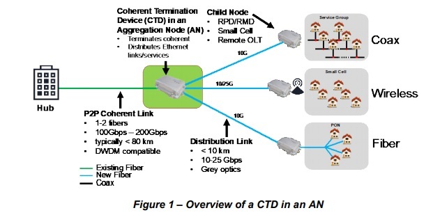 新規(guī)范是由CableLabs開發(fā)的點對點相干光學(xué)規(guī)范套件的一部分,定義了駐留在匯聚節(jié)點 (AN) 中的CTD,該節(jié)點將多個光纖端點組合到單個光纖或光纖對上。CTD本身包括一個或多個相干收發(fā)器來終止相干光學(xué)鏈路。