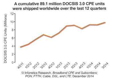 *三季度,累積出貨8910萬DOCSIS 3.0 CPE單位,這一數(shù)字超過過去12個(gè)季度的數(shù)量,即從Q411至Q314。