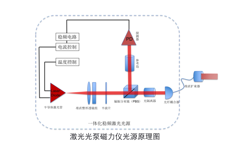下圖為激光光泵磁力儀的光源原理圖。為了保證磁力儀的檢測靈敏度,激光光泵磁力儀的光源必須要具有很好的頻率穩(wěn)定度,功率穩(wěn)定度以及優(yōu)化設(shè)計(jì)的光束直徑。因此,激光光泵磁力儀光源應(yīng)包括準(zhǔn)直整形,偏振分束,飽和吸收穩(wěn)頻光路以及相應(yīng)的高精度電流控制,溫度控制和穩(wěn)頻電路。另外,如果需要將穩(wěn)頻激光光束通過光纖傳輸?shù)酱帕x探頭以避免光源自身磁場對探測結(jié)果的干擾,還需要使用光纖耦合光路及后續(xù)的光纖準(zhǔn)直擴(kuò)束光路。