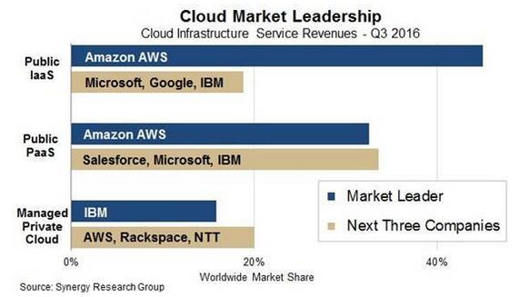 AWS是亞馬遜無(wú)心插柳的云計(jì)算業(yè)務(wù),如今已成為全球最大的云計(jì)算廠商,是當(dāng)之無(wú)愧的云計(jì)算霸主。根據(jù) Synergy Research Group 數(shù)據(jù),2016年第三季度 AWS 在全球 IaaS 公開(kāi)市場(chǎng)份額為45%,是微軟、谷歌和 IBM 三大廠商總和的兩倍多;在全球PaaS公開(kāi)市場(chǎng),AWS的市場(chǎng)份額幾乎超過(guò)Salesforce、微軟和IBM三大廠商之和。如下圖所示。