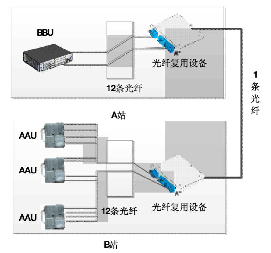 因此,為加速完成5G網(wǎng)絡(luò)建設(shè),在運營商中提前部署重點區(qū)域5G建設(shè),可在地鐵“A站(近端BBU)”至“B站(遠端AAU)”傳輸線路段利用光纖復(fù)用設(shè)備對原有纖芯資源擴容,實現(xiàn)快速重構(gòu),具體建設(shè)方案如圖2所示,利用1:12聚合光纖復(fù)用設(shè)備,從地鐵現(xiàn)網(wǎng)中挖掘出原有近端BBU和遠端AAU之間的光纖資源,再通過波分復(fù)用技術(shù)將光信號傳送至1條光纖中進行傳輸,纖芯資源僅耗費1芯即可完成網(wǎng)絡(luò)建設(shè),對于高密度組網(wǎng)的5G網(wǎng)絡(luò)有極強的擴展性,有利于在地鐵特殊場景下快速大規(guī)模部署5G網(wǎng)絡(luò)。