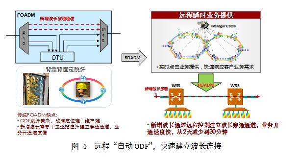 通過帶寬資源池+遠(yuǎn)程“自動(dòng)ODF”,通過空閑的支路端口和提前備好的線路波道構(gòu)筑的帶寬資源池,在網(wǎng)管上遠(yuǎn)程端到端配置業(yè)務(wù),具備波長無關(guān)、方向無關(guān)功能的ROADM可以自動(dòng)建立波長連接,免去逐站ODF跳纖,業(yè)務(wù)開通和調(diào)整效率大幅提升,時(shí)間可縮短至30分鐘,未來配合T-SDN等軟件可以進(jìn)一步減少到分鐘級(jí)。