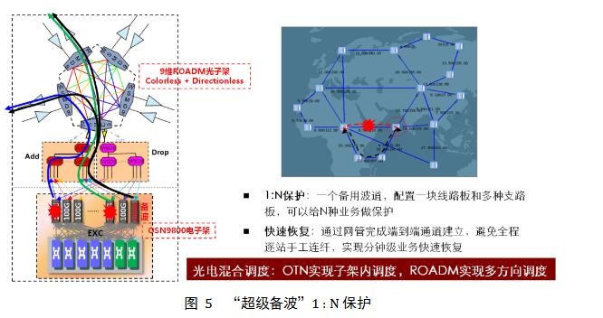 “超級(jí)備波”1:N保護(hù),只要增加一塊線路單板(直接利用備波線路板,不需要額外配置),通過光電混合交叉調(diào)度:OTN實(shí)現(xiàn)電子架內(nèi)調(diào)度,ROADM實(shí)現(xiàn)光子架多線路方向調(diào)度,即可保護(hù)子架內(nèi)所有線路方向的所有業(yè)務(wù)。