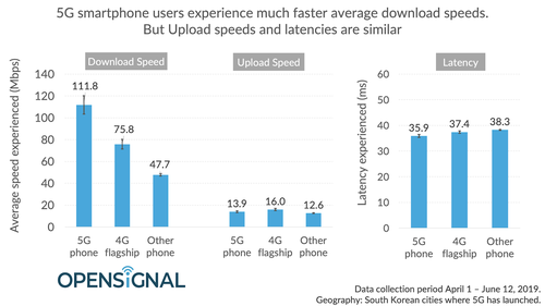 Opensignal發(fā)現(xiàn),在韓國三星S10 5G和LG電子V50 ThinQ 5G等5G下載的平均下載速度為118 Mbit / s,比同類近期4G智能手機快48%,比其他4G手機快143%。