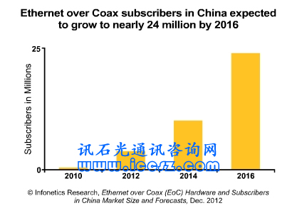 【訊石光通訊咨詢網(wǎng)】Infonetics分析師Jeff Heynen表示:“中國的電視用戶達(dá)到2億并且還在快速增長,這為中國的有線電視運(yùn)營商成為挑戰(zhàn)中國電信和中國聯(lián)通的固網(wǎng)寬帶服務(wù)提供商提供了巨大的機(jī)會。鑒于中國獨(dú)特的多住戶單元為主的環(huán)境,其有線電視運(yùn)營商正采用以太網(wǎng)同軸電纜(Ethernet over Coax,后簡稱EoC)技術(shù)來迅速推出寬帶服務(wù)與光纖部署競爭。”
