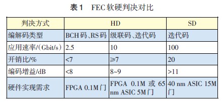 FEC技術(shù)以編碼冗余度(7%~20%)以及相應(yīng)的芯片處理復(fù)雜度來?yè)Q取更大的凈增益,同時(shí)也是改善100G系統(tǒng)OSNR要求的關(guān)鍵技術(shù)之一。光互聯(lián)論壇(OIF)建議軟判決FEC開銷比小于20%,糾錯(cuò)極限可以達(dá)到1E-2量級(jí)。根據(jù)研究結(jié)果,低于20%開銷比時(shí)凈增益隨著冗余度增加而增大,而超過后受錯(cuò)誤平層(Error Floor)影響增益反而下降[1]。另外,信號(hào)速率提高導(dǎo)致數(shù)模轉(zhuǎn)換(ADC)和DSP處理能力要求也急劇增加(見表1)。7%開銷的硬判決(HD)方式(有些廠商也采用FEC開銷比大于7%的HD方式),ADC的采樣率一般需要56 GSa/s左右,軟判(SD)的開銷比達(dá)到20%時(shí),線路速率達(dá)到128 Gbit/s,ADC采樣速率一般需要64 Gsa/s左右,功耗基本要比硬判決高出20%左右,同時(shí)也要采用40 nm 甚至28 nm 工藝的專用集成電路(ASIC)技術(shù)才能實(shí)現(xiàn)高運(yùn)算量和低功耗目標(biāo)[2]。從目前設(shè)備廠商的設(shè)備具體實(shí)現(xiàn)來看,大部分廠商傾向于軟硬結(jié)合的判決方式,以平衡算法復(fù)雜度、功耗等關(guān)鍵參數(shù)。