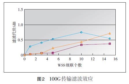 100G系統(tǒng)多跨段長(zhǎng)距離傳輸一般都需要采用基于波長(zhǎng)選擇開關(guān)(WSS)的可重構(gòu)分插復(fù)用器(ROADM)進(jìn)行功率均衡,同時(shí)考慮到未來100G系統(tǒng)城域網(wǎng)應(yīng)用,100G系統(tǒng)也需要支持多個(gè)ROADM級(jí)聯(lián)傳輸,因此研究100G系統(tǒng)信號(hào)的多級(jí)濾波效應(yīng)非常重要。