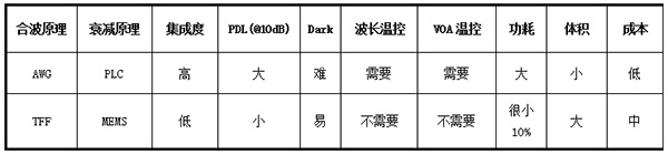 光可調波分復用器(VMUX)的實現(xiàn)功能主要為:光功率自動控制及DWDM系統(tǒng)的分合波技術,DWDM系統(tǒng)分合波的實現(xiàn)技術有FBG、TFF及AWG技術,目前主要應用為TFF及AWG技術;光功率陣列衰減技術主要有MEMS陣列衰減 、液晶陣列及熱光波導技術(PLC-VOA)陣列技術;目前主流應用技術為MEMS陣列及熱光波導陣列技術,具體目前VMUX主要商用技術,如表1所示。