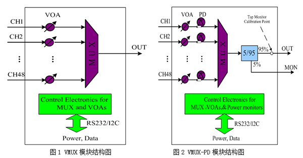 光可調波分復用器(VMUX)的系列產(chǎn)品,分為開環(huán)控制型和閉環(huán)控制型,即VMUX及VMUX-PD兩種產(chǎn)品,具體方案如圖1﹑2所示。