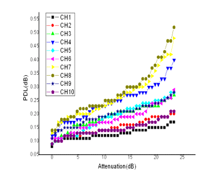 目前PLC-VOA Array通道衰減范圍可以達到35dB以上,同時具備良好的PDL、響應時間及溫度特性,其電光曲線及PDL特性如圖5、6所示:
