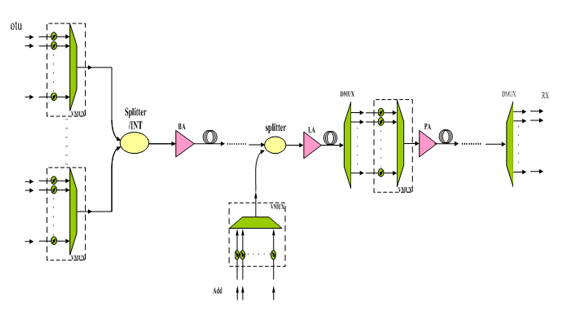 VMUX在OTN系統(tǒng)中的光傳輸層得到大量應用,主要用于通道功率控制,實現(xiàn)預均衡功能;一方面配置在OTM 站點,能夠對各通道的光功率單獨調整,實現(xiàn)通道功率的預均衡,調整OTU發(fā)光功率,并保證一致性,實現(xiàn)合波輸出;另一方面應用于OA站點配合AWG使用,解決線路傳輸中的通道功率增益不平坦問題,相當于DGE或DCE模塊的功能;同時VMUX也可以用于OADM站點的上波ADD預均衡功能;另外VMUX也可用于光線路接收端,調整不同通道功率一致性,提高接收機的靈敏度。