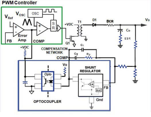 我們首先將討論一個(gè)反激式轉(zhuǎn)換器拓?fù)?,因?yàn)榫驮骷?shù)目而言,它是最簡單的電路。反激式電路使用最少的開關(guān);本例中,僅在初級端使用了一個(gè)開關(guān),并在次級端使用了一個(gè)整流二極管。簡單反激式電路通常用于輸出功率相對較低的應(yīng)用中,但它確實(shí)具有高輸出紋波電流和低交越頻率,因?yàn)榇嬖谟野肫矫?RHP)零點(diǎn)。結(jié)果,反激式電路需要具備較大輸出紋波電流額定值的大輸出電容。圖1顯示采用光耦合器的方式,分流調(diào)節(jié)器在其中用作隔離式輸出電壓Vo的反饋電壓誤差放大器。分流調(diào)節(jié)器用作精確標(biāo)準(zhǔn)時(shí),可提供精度典型值為2%的基準(zhǔn)電壓。輸出電壓經(jīng)過分壓,然后由內(nèi)部誤差放大器將其與分流調(diào)節(jié)器的基準(zhǔn)電壓進(jìn)行比較,比較結(jié)果輸出至光耦合器的LED電路。光耦合器LED由輸出電壓和串聯(lián)電阻偏置,所需的電流量根據(jù)光耦合器電流傳輸(CTR)特性確定。