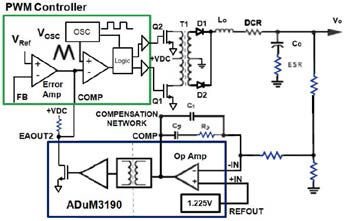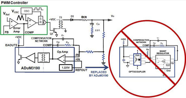 設(shè)計(jì)人員設(shè)計(jì)隔離式AC-DC、DC-DC或DOSA兼容型電源模塊時(shí),面臨著以更佳的性能應(yīng)對市場需求的挑戰(zhàn)。本文介紹數(shù)字隔離器誤差放大器,它可改進(jìn)初級端控制架構(gòu)的瞬態(tài)響應(yīng)和工作溫度范圍。傳統(tǒng)的初級端控制器應(yīng)用是利用光耦合器提供反饋回路隔離,利用分流調(diào)節(jié)器提供誤差放大器和基準(zhǔn)電壓。雖然光耦合器作為隔離器用于電源中具有成本低廉的優(yōu)勢,但它會將最大環(huán)路帶寬限制在50 kHz,而且實(shí)際帶寬會低得多。快速可靠的數(shù)字隔離器電路在單封裝內(nèi)集成隔離式誤差放大器和精密基準(zhǔn)電壓源功能,使用該電路可實(shí)現(xiàn)極低溫漂和極高帶寬的精密隔離式誤差放大器。隔離式誤差放大器能實(shí)現(xiàn)250 kHz以上的環(huán)路帶寬,使得以更高開關(guān)速度工作的隔離式初級電源設(shè)計(jì)成為可能。借助正確的電源拓?fù)?,更高的開關(guān)速度可支持在更為緊湊的電源中使用更小的輸出濾波器電感和電容。
