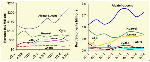 ICCSZ訊 近日發(fā)布的Dell‘Oro Access Report 2Q14顯示,在全球GPON(不包含亞太)和VDSL市場,阿爾卡特朗訊均表現(xiàn)強勁,居于領(lǐng)先地位。