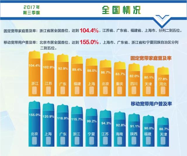 從各地的寬帶發(fā)展普及狀況看,固定寬帶家庭普及率方面,浙江省最高,達(dá)到104.4%,江蘇省也達(dá)到102.9%,超過了100%(固定寬帶家庭普及率超過100%,主要是存在一個(gè)家庭用戶擁有多個(gè)固定住所,辦理了多個(gè)固定寬帶接入業(yè)務(wù)的情況),排在前五位的地區(qū)還有廣東省、福建省和上海市。