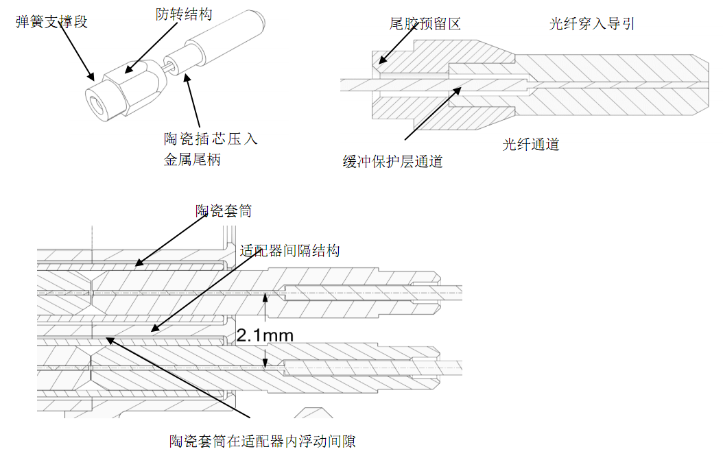陶瓷插芯內(nèi)孔固定125um光纖,金屬尾柄內(nèi)孔用于固定光纖緩沖保護層。陶瓷插芯后尾端為錐孔結(jié)構(gòu),方便光纖穿入。