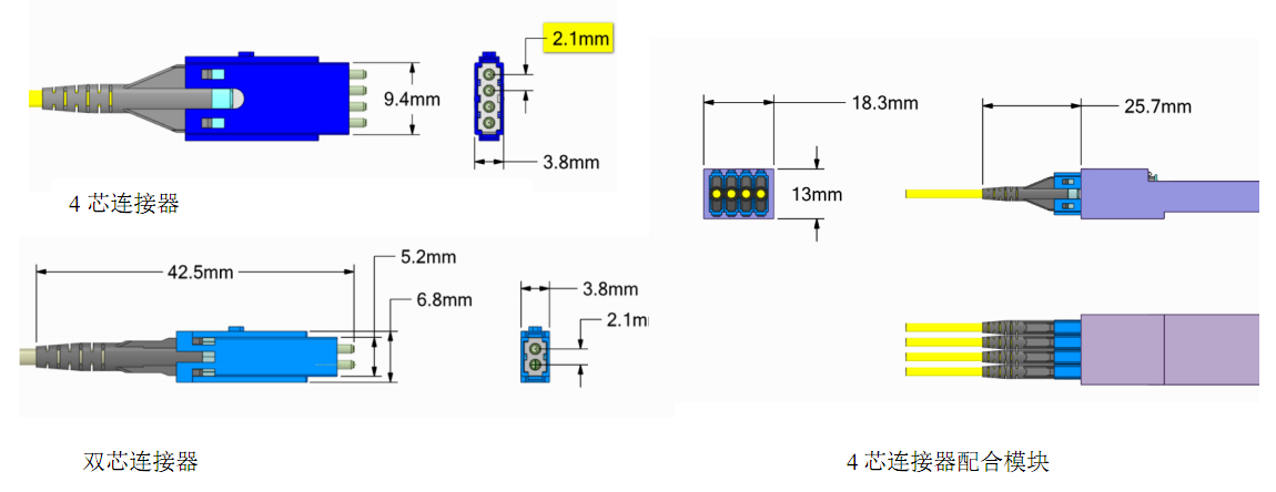 理論上在雙芯連接器和多芯連接器的整列排布方向上的間距尺寸可以達到陶瓷套筒外徑尺寸(陶瓷套筒外徑尺寸一般為1.62mm),但各陶瓷套筒之間需要被隔離,并且連接器對接的核心部件在適配器需要一定的浮動間隙,以具備更好的防側(cè)拉性能,所以新連接器的間距尺寸定為2.1mm。