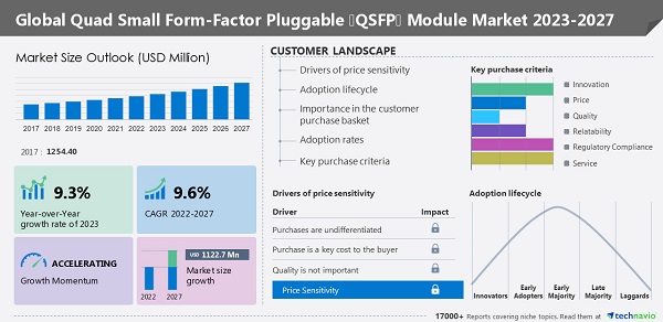 ICC訊(編譯:Nina)根據(jù)Technavio的最新預測,2023年,該市場將增長9.3%。從2022年到2027年,全球QSFP模塊市場規(guī)模將增加11.27億美元,思科和英特爾公司引領了這一機遇。