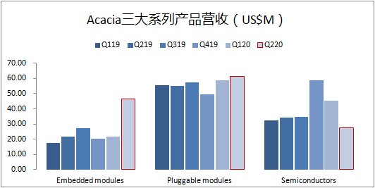 Acacia 10Q季度報(bào)表顯示,2020年第二季度,Acacia來自嵌入式模塊(Embedded Modules)的銷售收入為4674萬美元,同比增幅高達(dá)113.96%;來自可插拔模塊(Pluggable Modules)的銷售收入為6110萬美元,同比增長(zhǎng)11.29%;來自半導(dǎo)體(Semiconductors)的銷售收入為2737萬美元,同比下滑20.51%。