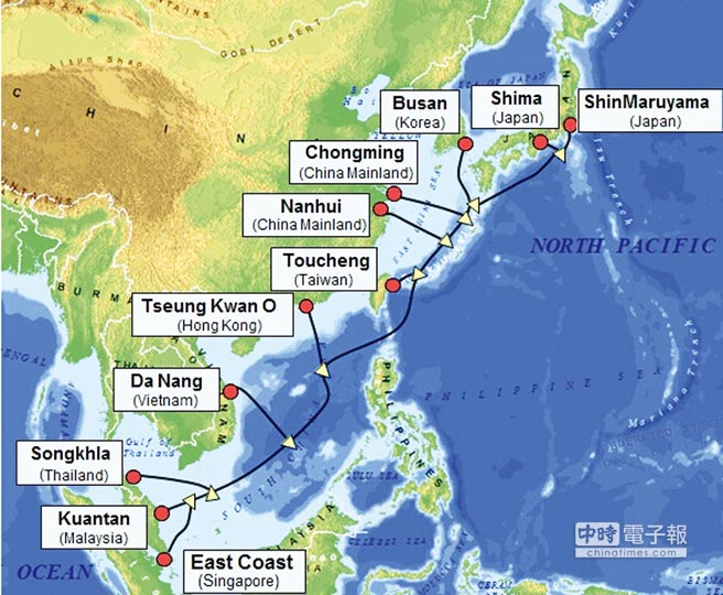 光纖海底電纜APG連接日本、韓國、中國、臺灣、香港、越南、泰國、馬來西亞、新加坡,全長約10,900km,并採用每個波長100Gbps的光波多工傳輸?shù)淖钚录夹g(shù),可以實(shí)現(xiàn)每秒超過54Tbps的傳輸容量。