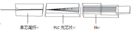 PLC光分芯片是通過特殊的制造工藝,在一種基板材料上生成一種一入多出的樹枝狀光波導通道,當光信號從輸出端進入時,會沿著光波導的路徑,分成多束光信號從輸出端射出,在PLC光芯片的輸入和輸出端耦合連接上FA(光纖陣列)和光纖端頭后,就可以完成正常的分光功能了。PLC光芯片的工作原理如圖1所示: